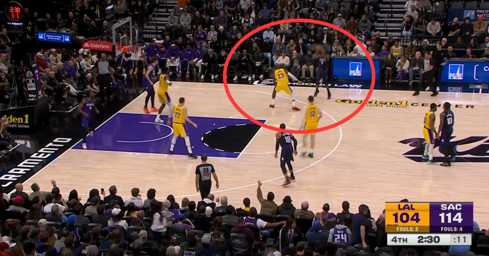 而就在这次反击过程当中,詹姆斯再次犯下大错,在防守端眼神防守,直接漏人。对面蒙克接到球原地干拔的时候,詹皇站在原地跳都没跳,连手都不伸,看着蒙克在他脸上命中三分,把分差重新变成13分。短短13秒,8分分差变13分,詹姆斯先是一次致命失误白送球权,回来又不防守,看着对面在他脸上投中3分,一攻一防,葬送球队。
